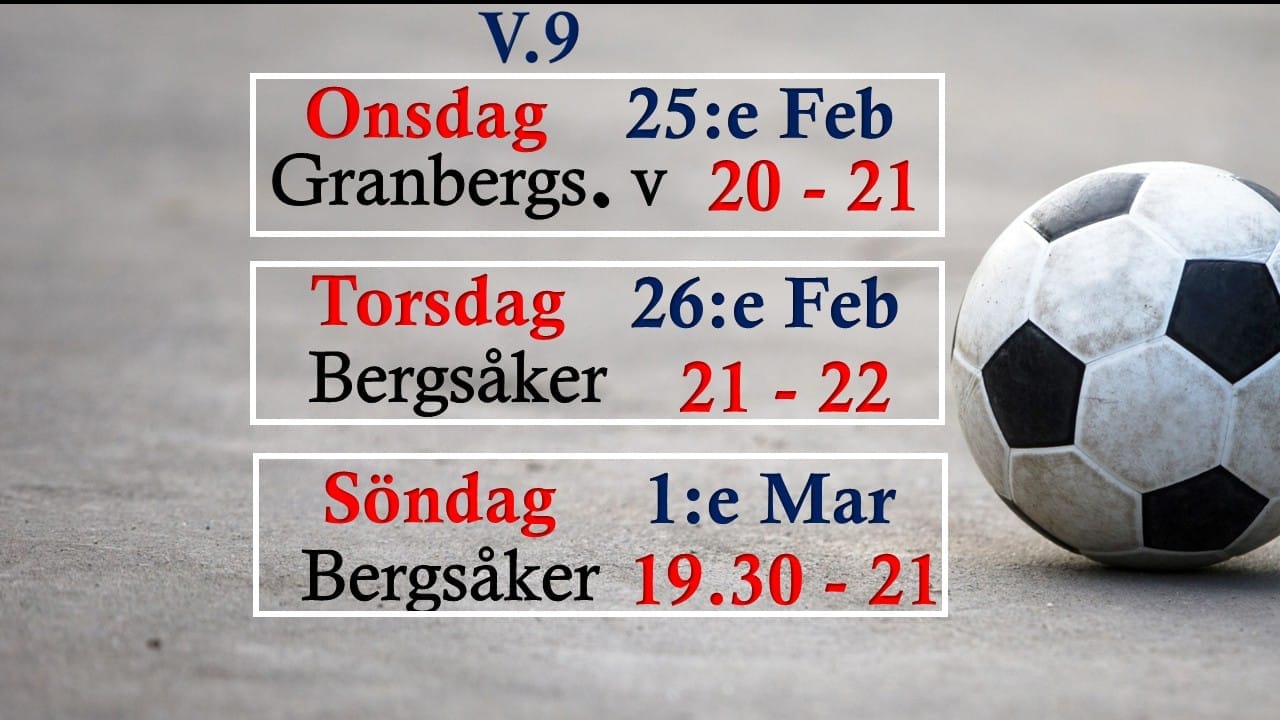 23 feb 2026 Träning V.9 ############Granbergsskolan onsdag 20-21Bergsåker torsdag 21-22Bergsåker 19.30-21 söndag############